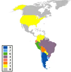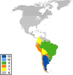Mapa que muestra la cantidad de veces que cada país ha salido campeón de la Copa América.Mapa que muestra las participaciones de los seleccionados americanos en el torneo.