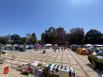 Imagen del Campamento propalestino en la Universidad de California previo a su ataque por parte de los contramanifestantes el 1 de mayo.Cuatro agentes de la ley y un hombre armado mueren y otros cuatro resultan heridos durante un tiroteo en Charlotte, Carolina del Norte.[75]