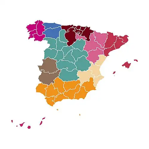 Se estructura de forma análoga a la división territorial del Estado español. De menor a mayor extensión las siguientes unidades organizativas:
