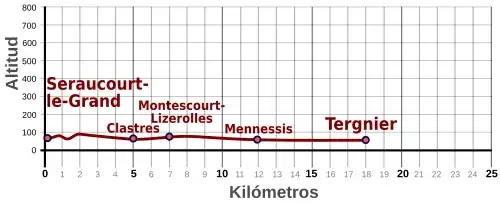 La ruta abandona Seraucourt-le-Grand en dirección sureste discurriendo unos km por el sendero GR-655 que abandona al poco para continuar por la carretera local D-341 por la que llega a Clastres (600 hab.) tras 5 km.[13] Abandona esta población por la D-34 y 2 km después alcanza Montescourt-Lizerolles (1700 hab.) que cuenta con estación de ferrocarril y un jardín privado declarado patrimonio cultural[14]. Tras esta localidad continúa junto a la vía del tren y cruza el Canal de Saint-Quentin para alcanzar tras 6 km Mennessis (400 hab.). A Tergnier, el final de la etapa, se llega tras otros 6 km durante los que se vuelve a cruzar por dos veces el anteriormente citado canal.[13]