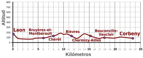 La ruta abandona Laon por la Porte d'Ardon y se dirige hacia el sur.[22] Justo a la salida deja a su derecha la abadía de Saint-Vincent situada en un promontorio.[22] Sus orígenes se remontan al siglo VI, fue saqueada por los normandos y resultó gravemente afectada por un incendio en una fecha tan reciente como 2008.[23] Cruza el río Ardon y tras 6 km alcanza Bruyères-et-Montbérault[22] de 1500 habitantes y cuya iglesia de Notre Dame así como unas instalaciones militares al este del pueblo, la batterie de Bruyères, están declarados momentos históricos.[24] El camino continúa hacia el sureste pasando a los 2 km por Chérêt (120 hab.) y tras 3.5 km por Bièvres (70 hab.).[22] Después de 3.5 km llega a Chermizy-Ailles (107 hab.) y tras otros 3 km a Bouconville-Vauclair (200 hab.)[22] en cuyas afueras se encuentran los restos de la abadía de Vauclair del siglo XII[25] y una red de trincheras de la Primera Guerra Mundial,[26] ambos declarados momentos históricos. El camino recorre otros 5 km más de ruta, en los que se atraviesa un bosque, y alcanza finalmente Corbeny,[22] una pequeña localidad de 750 habitantes que fue completamente arrasada durante la I Guerra Mundial[27] y donde llega el Chemin des Dames (Camino de las Damas) que dio nombre a un sector de trincheras donde se desarrollaron terribles batallas entre las que, solo en la de 1917, el ejército francés al mando de Robert Nivelle perdió 187 000 hombres. Esta elevada pérdida de vidas humanas dio lugar a motines dentro del ejército y a la sustitución de Robert Nivelle por Philippe Pétain.