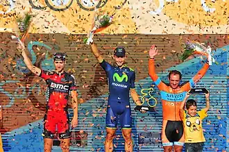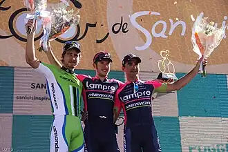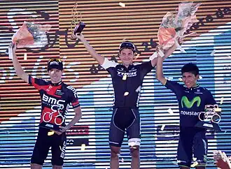 Etapa 5Una crono plana y corta en la ciudad de San Luis, era el escenario para que se lucieran los especialistas, entre los que se destacaba Taylor Phinney del BMC. También sería una jornada clave en la lucha por el maillot naranja, ya que Phillip Gaimon contaba con solo 4 segundos de ventaja sobre Nairo Quintana. La sorpresa la dio el italiano del Movistar Adriano Malori batiendo a Phinney por 3 segundos, mientras el local Jorge Giacinti terminó tercero. En la lucha por la general, Quintana paró los relojes 30 segundos antes que Gaimon y lo desplazó del primer lugar, logrando la 16.ª posición en la etapa (a 1 min 18 s de Malori) mientras que el estadounidense fue 33º. Darwin Atapuma que peleaba por un lugar en el podio final también relegó posiciones al finalizar a 2 minutos de Quintana.[6] ![]()