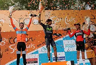 Etapa 4Potrero de los Funes-Cerro El Amago 168,7 kmLa 4.ª etapa fue con un final inédito en el Cerro El Amago de 1ª categoría. Comenzó en el Circuito de Potrero de los Funes y tras un recorrido plano, al pasar por San Francisco del Monte de Oro la carretera picaba hacia arriba para pasar por el Alto del Embalse (3ª categoría). Luego comenzó el ascenso final en una carretera de cemento que culminó a 1.720 de altitud. La subida de 10,5 km de longitud y 7,2 % de promedio, tenía rampas de hasta 11,5 % y el último kilómetro de 10,7 %. La etapa en sí, no finalizó en alto, ya que luego de coronado el Cerro El Amago faltaban 1,8 kilómetros para la meta. ![]() En la primera parte de la etapa se formó la escapada del día integrada por Juan Ignacio Curuchet (Argentina), Juan Esteban Arango (Colombia), Jonny Clarke (UnitedHealthcare), Julián Gaday (Buenos Aires Provincia) y Matías Presa (Uruguay) pero su esfuerzo sucumbió a 20 km para la llegada. Comenzado el ascenso al Cerro El Amago, el primero en salir fue el argentino del San Luis, Sergio Godoy. Nairo Quintana respondió al ataque y ambos comenzaron a alejarse del grupo. El ritmo que impuso Quintana terminó por descolgar a Godoy quedando el colombiano solo en la delantera. Mientras por detrás se formó un pequeño grupo con Atapuma, Moyano, Rubiano y Lucas Euser, el líder de la general Phillip Gaimon iba quedando retrasado. Quintana coronó el cerro y con los puntos que obtuvo alcanzó el liderato por el maillot de la montaña, hasta ese momento en manos de Julián Arredondo. Llegó a la meta en forma solitaria ganando la etapa y aventajando en 50 segundos a Sergio Godoy y un minuto y medio a Atapuma. Gaimon, que en la general le llevaba a Quintana 4 min 19 s, llegó a 4 min 15 s del colombiano con lo cual retuvo el maillot de líder por apenas 4 segundos.[5]