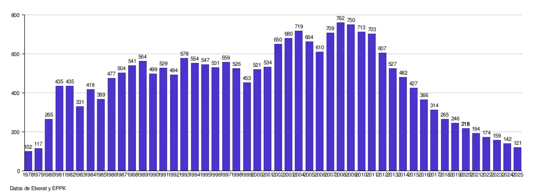 El número de presos relacionados con el grupo terrorista ha variado a lo largo de los años como refleja la siguiente tabla, que comienza en el año 1978 tras la amnistía de 1977 en que salieron todos los presos con delitos de raíz política de la época del franquismo y principios de la Transición Española (hasta las elecciones del 15 de junio de 1977). Su situación tiene relación con la persistencia del terrorismo.[1][2] [3][4] En su mayoría cumplen condena o están acusados por delitos de terrorismo, y pertenecen o pertenecían a ETA o a otras organizaciones políticas y culturales vinculadas a ésta según la jurisdicción española. Los datos provienen de Etxerat, asociación de familiares de estos presos.