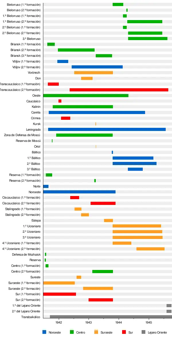 Dependiendo de la evolución de la situación estratégica, algunas formaciones de primera línea se disolvieron, otras se crearon nuevamente y algunas cambiaron de nombre. Por ejemplo, el 12 de julio de 1942, la administración del Frente Sudoeste se disolvió y sus tropas pasaron a formar parte del creado Frente de Stalingrado. El 7 de agosto de 1942, el Frente de Stalingrado se dividió en dos: el Frente de Stalingrado y el Frente Sureste, pero ya el 10 de agosto de 1942, el Frente de Stalingrado, que permaneció bajo su nombre, quedó subordinado al Frente Sudeste. El 28 de septiembre de 1942, el Frente de Stalingrado pasó a llamarse Frente del Don y el Frente Sudeste se convirtió en Frente de Stalingrado. En total, durante la guerra, sin contar las direcciones del Frente de Defensa Aérea, se crearon 24 direcciones de primera línea.