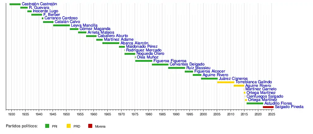 Con la fundación del Partido Nacional Revolucionario (hoy Partido Revolucionario Institucional) en 1929 todos los gobernadores provinieron de este partido, hasta que en las elecciones del 6 de febrero de 2005, el perredista Carlos Zeferino Torreblanca Galindo, derrotó al candidato del PRI y en las elecciones del 30 de enero de 2011 ganó el gobernador Ángel Aguirre Rivero con la coalición Guerrero nos Une conformada por el PRD, PT, Convergencia y en último momento el PAN se unió cediéndole al candidato sus votos.