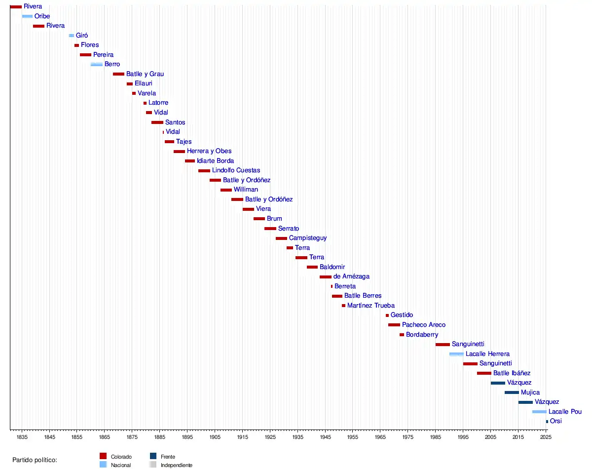 | 27 | Oribe, Giró, Pereira, Berro, Batlle y Grau, Ellauri, Latorre, Herrera y Obes, Batlle y Ordóñez, Williman, Serrato, Campisteguy, Terra, Baldomir, de Amézaga, Berreta, Batlle Berres, Martínez Trueba, Gestido, Pacheco, Bordaberry, Sanguinetti, Lacalle Herrera, Batlle Ibáñez, Vázquez, Mujica, Lacalle Pou | |