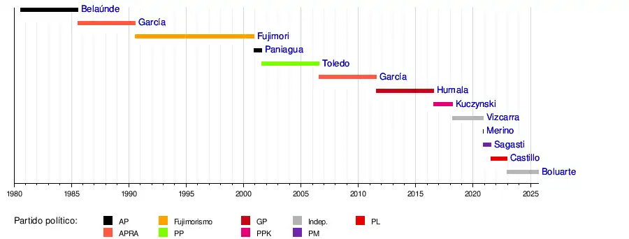 - Se toman en cuenta las variaciones de la índole del gobierno para poder englobar la complejidad de la historia del país. Es el caso de Óscar Raimundo Benavides en su primer gobierno que, pese a ser uno solo, fue en primera instancia fruto de un golpe de Estado y fue luego ratificado por el Congreso. Es también el caso de los mencionados Augusto Leguía y de Alberto Fujimori.