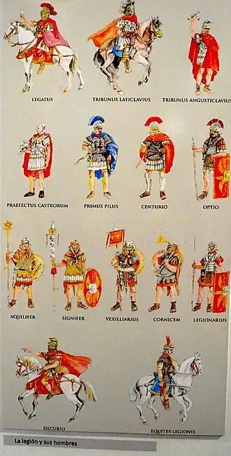 - Legio (Legión Imperial) – Legión compuesta por nueve cohortes y una primera cohorte. El comandante general de la legión era el legatus legionis , asistido por el praefectus castrorum y otros oficiales superiores.