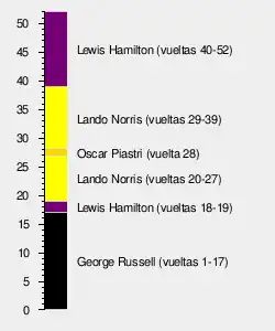 Poco después, el sol saldría en el circuito ocasionando nuevas paradas posteriores en los pits para cambiar a neumáticos slicks. Con 30 vueltas cumplidas, Norris lideraba la carrera con tres segundos de diferencia ante Hamilton, Verstappen marchaba tercero y Russell cuarto. Este último, reportó una fuga de agua de su Mercedes W15, los mecánicos le pidieron retirar el monoplaza de la carrera.[17][18]