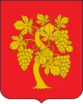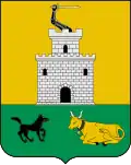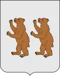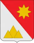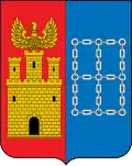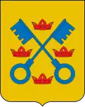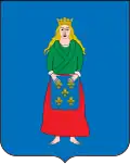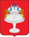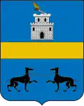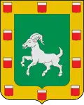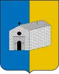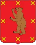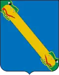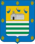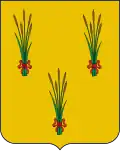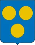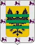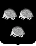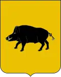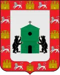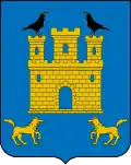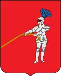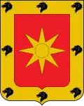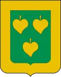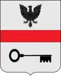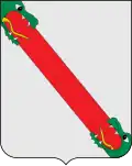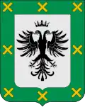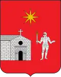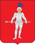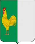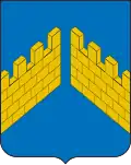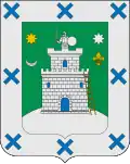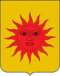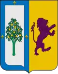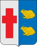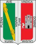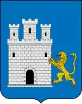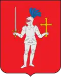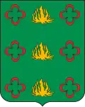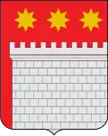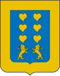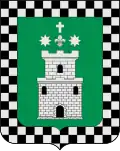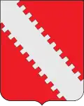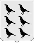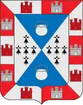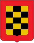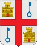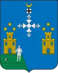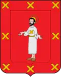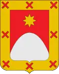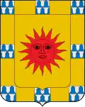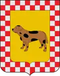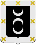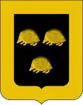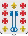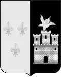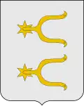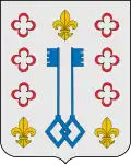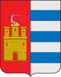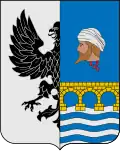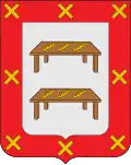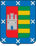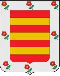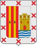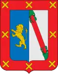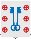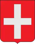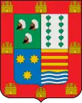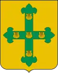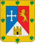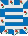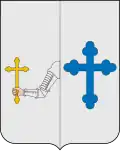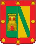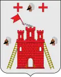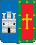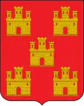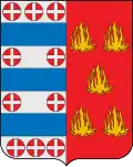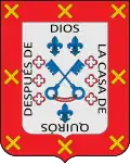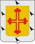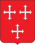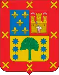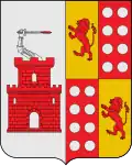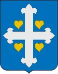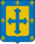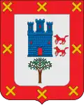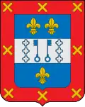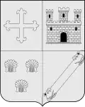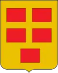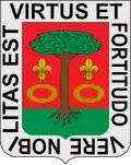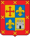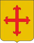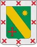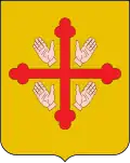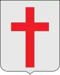- ↑ Hay otra versión del escudo que cambia la rosa situada en jefe, por una cruz llana.
