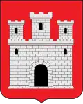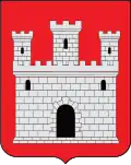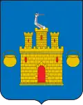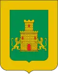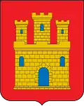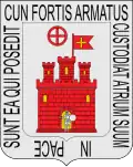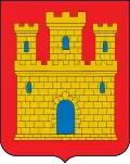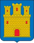 De gules con un castillo de oro en cuyo homenaje asoma un hombre armado, que sostiene en sus manos una banderola. Otro hombre armado, con lanza, en la puerta del castillo. De las almenas laterales de la torr, arrancan dos alas de oro, una a cada costado. [‘‘n’‘ 3] |