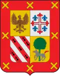 Terciado en banda: 1º. De gules con un león rampante de oro. 2º. De oro. 3º. De azur con seis lises de oro, dispuestas en dos fajas. Otros dicen: De oro, con una banda de gules; sobre la banda, un león de gules y bajo ella, seis lises de azur, dispuestas en dos fajas. |