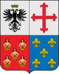 - ↑ Otros pintan las aspas de la bordura de oro, y otros en vez de las tres fajas del segundo cuartel, colocan tres palos.