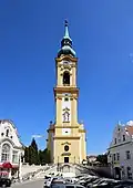 Torre de iglesia más alta de la Baja Austria. Obra de Peter Mollner (1777-1778) en estilo clasicista temprano después de la demolición de la nave gótica . La torre se añadió a la antigua iglesia unos años antes (1722-1725), bajo la dirección del maestro albañil Franz Jänggl. | ||