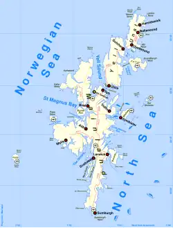 - Mainland Suroeste: Billia Cletts, Black Skerry, Burwick Holm, Cure Holm, Griskerry, Holm of Maywick, Hoove Holm, Housensellar, Kirk Skerry, Little Fogla Stack, Sheep-pund, The Skerry.