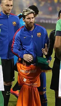 El 4 de febrero de 2017, Messi anotó su 27° tiro libre para el Barcelona en la victoria en casa por 3-0 sobre el Athletic de Bilbao en la liga, superando a Koeman como el máximo goleador de todos los tiempos del club en tiros libres.[174][175][176] El 8 de marzo, se produjo un hecho inédito y sin precedentes en la historia de la máxima competición europea;[177] el F.C. Barcelona remontó un 0-4, jugado un mes atrás en el Parque de los Príncipes, por los octavos de final ante el París Saint-Germain.[178] El resultado de la vuelta fue 6-1 en el Camp Nou,[179] otorgando al equipo azulgrana el pase a los cuartos de final, siendo hasta la fecha, el único equipo español con opciones al triplete.[180] Con un gol de penalti, Messi aumentó sus registros goleadores,[181] como máximo artillero de la Liga de Campeones 2016-2017 con 11 goles.[182] El 19 de marzo, el argentino alcanzó los 100 dobletes con el Barça, además de los más de 40 goles por temporada en los últimos ocho cursos;[183][184] en el partido disputado ante el Valencia en el Camp Nou por la vigésima novena fecha de la Liga, con un resultado de 4-2 a favor del equipo blaugrana.[185][186] El 23 de abril, Messi marcó dos goles en la victoria a domicilio por 3-2 sobre el Real Madrid. Su gol de la victoria en el tiempo de descuento fue el número 500 con el Barcelona. Su memorable celebración lo vio quitarse la camiseta del Barcelona y mostrársela ante los enfurecidos seguidores del Real Madrid, con su nombre y número de cara a la multitud.[187][188][189] El 27 de mayo, tras ser eliminado en cuartos de final de la Liga de Campeones por la Juventus y acabar como subcampeón de La Liga, el F.C. Barcelona se proclamó campeón de la Copa del Rey 2016-2017.[190] El partido terminó con un resultado de 3-1 ante el Deportivo Alavés con un gol y asistencia de Messi,[191] en el que fue el partido despedida de Luis Enrique como entrenador azulgrana, y el último partido oficial que se jugara en el mítico estadio Vicente Calderón.[192] En total, Messi terminó la temporada 2016-17 con 54 goles y 16 asistencias, mientras que sus 37 goles en La Liga lo llevaron a ganar los premios Pichichi y la Bota de Oro europea por cuarta vez en su carrera.[193]