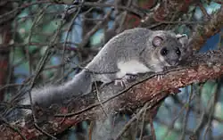 L: <19 cm. C: 12-17 cm. De color gris uniforme con prominentes ojos negros y cola larga y poblada como la de una ardilla. Es un arborícola de hábitos nocturnos que se aletarga durante el invierno. | ||