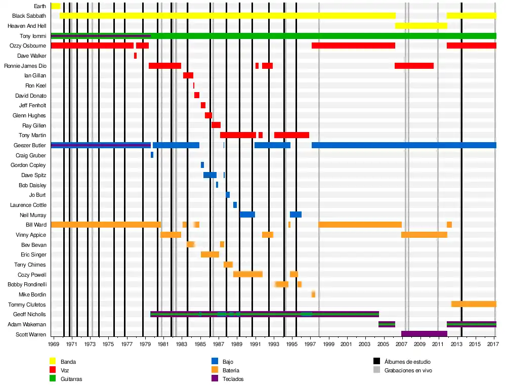La agrupación original permaneció unida durante ocho años, con la cual publicaron ocho álbumes, aunque Osbourne se retiró brevemente de la banda durante 1977 siendo sustituido por Dave Walker. Ozzy Osbourne fue finalmente despedido de la banda en 1979 debido a su adicción al alcohol y drogas, siendo remplazado por el ex Rainbow Ronnie James Dio. Desde entonces, la banda ha sufrido muchos cambios en su alineación, con un total de veintidós miembros aprox.; incluyendo a los ex Deep Purple Ian Gillan y Glenn Hughes, los bajistas Neil Murray y Dave Spitz y los bateristas Cozy Powell y Eric Singer. Tony Iommi es el único miembro que ha permanecido en la banda desde su formación en 1968. La alineación original se reunió por primera vez en los conciertos de Live Aid 1985 cuyo motivo fue recaudar fondos en beneficio de los países de África Oriental, nuevamente se reunirían en 1997 y 1999 y desde entonces han permanecido.