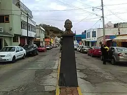 Monumento que perpetuaba la imagen del compositor y cantautor hidalguense, Nicandro Castillo.[32] en el año 2010 el busto fue robado y tiempo después fue colocado un nuevo busto.[32] El monumento fue elaborado con aportaciones económicas de los vecinos.[32] Características Se trata de un busto del personaje sobre un pedestal trapezoidal de color crema. Ubicación Se encuentra ubicado en la Calle de Veracruz de la Colonia Cubitos. Coordenadas | |