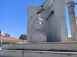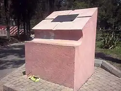 Inaugurado el 26 de noviembre de 1941, obra de Medardo Anaya Armas de estilo art déco.[55] Características Es un mausoleo de estilo clásicao, con de dos elementos, la base rectangular escalonada y la cabecera de tipo obelisco rematando con el relieve escultórico de un águila y en su parte frontal abrazando el volumen escultórico el busto de Felipe Ángeles.[55] Cuenta con un escudo de armas de granada de artillería con flamas, cañones cruzados que representan la fuerza que une a los miembros del Ejército, cestón que simboliza la unión de las fuerzas armadas, flama del pebetero de la antorcha y los rayos que simbolizan las cinco virtudes honor, lealtad, patriotismo, valor y abnegación.[55] Ubicación En el Panteón Municipal de Pachuca. Coordenadas | |