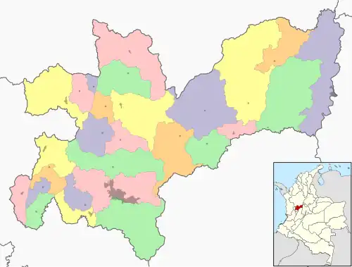 Caldas es un departamento colombiano compuesto de 27 municipios, organizados en 6 subregiones a saber, los municipios a su vez están divididos en corregimientos y/o veredas, además de contar con la cabecera municipal donde se concentra cerca del 70% de la población departamental, también cuenta con otros centros poblados (inspecciones de policía, caseríos) y resguardos indígenas.[1]