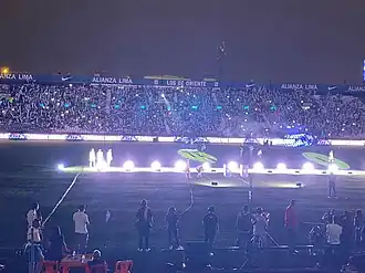 La presentación empezó, como de costumbre, luego de los números musicales mientras ingresa el público asistente al estadio en las horas previas. Las artistas Clara Yolks, Milena Warthon y Nicole Favre estuvieron a cargo de la música en vivo, tanto en la previa del encuentro como en el entretiempo.