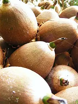 | Nuez de India o Calumbán | Aleurites moluccanus | Semilla de Drupa | El fruto drupáceo es semejante a la nuez común, con piel de color verde, y contiene de 1 a 2 semillas globosas, las nueces, de cáscara dura y un segundo tegumento o piel semejante a las avellanas, con alto contenido en aceite. Las nueces se consumen en platos de cocina suroriental y el aceite es un buen combustible. | ![]() |