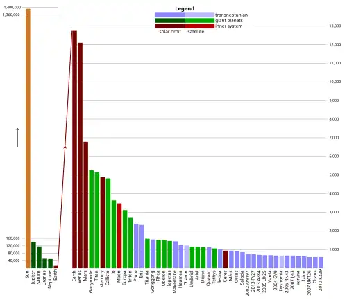 Por simplicidad y propósitos comparativos, los valores se calculan manualmente asumiendo una esfericidad de 1. El tamaño de los cuerpos sólidos no incluye la atmósfera de un objeto. Por ejemplo, Titán parece más grande que Ganímedes, pero su cuerpo sólido es más pequeño. Para el planeta gigante s, el "radio" se define como la distancia desde el centro en el que la atmósfera alcanza 1 bar de presión atmosférica.[8] El radio de los anillos principales de Saturno es 136.775 km.