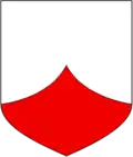 Se dice del escudo dividido por dos trazos curvos, que parten del centro para alcanzar los dos ángulos de la punta. De plata entado en punta de gules.