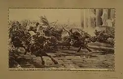 Un hombre en el suelo con una cuerda en la mano con la que ata a un perro, y la caza del jabalí