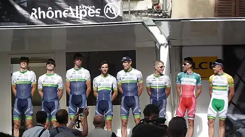 - ↑ Formó parte del equipo como corredor hasta el 21 de mayo, (su última carrera fue el Tour de California). Luego se retiró del ciclismo y siguió como asesor técnico del equipo.