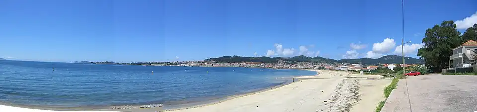 29. Playa de Vilariño, Es una playa urbana situada en el núcleo de Vilariño al final de la ría de Aldán. Tiene 500 m de longitud y 60 de anchura media. Sus aguas son tranquilas y cálidas y la arena blanca. El acceso es rodado. Tiene todos los servicios y suele ostentar Bandera Azul.