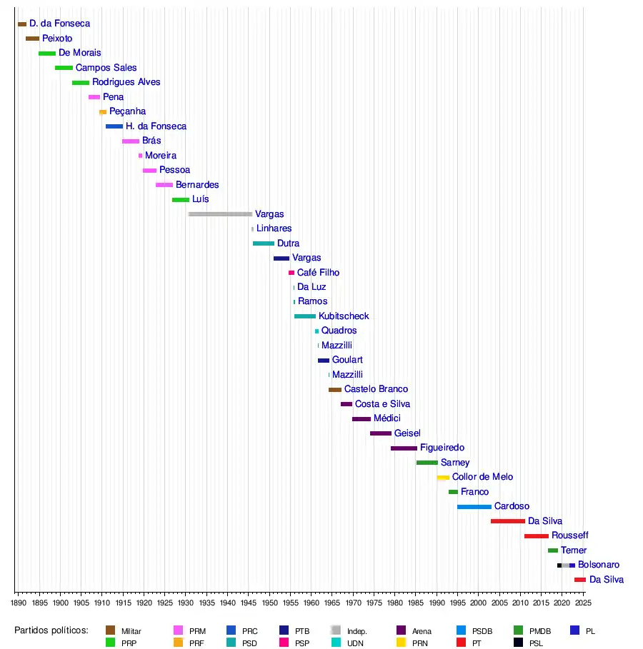 - ↑ Getúlio Vargas ejerció de facto la presidencia entre el 3 de noviembre de 1930 y el 20 de julio de 1934, en condición de jefe do Gobierno Provisorio. El 17 de julio de 1934 fue elegido por la Asamblea Nacional Constituyente presidente de la República, formalmente investido tres días después. El 10 de noviembre de 1937 dio un golpe de estado que instituyó el Estado Novo y prorrogó su período presidencial.