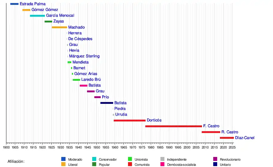 Miguel Díaz-CanelRaúl CastroFidel CastroOsvaldo Dorticós TorradoManuel Urrutia LleóCarlos Manuel PiedraFulgencio BatistaCarlos Prío SocarrásRamón Grau San MartínFulgencio BatistaFederico Laredo BruMiguel Mariano GómezJosé Agripino Barnet y VinagerasCarlos MendietaManuel Márquez SterlingCarlos HeviaRamón Grau San MartínCarlos Manuel de Céspedes y QuesadaAlberto Herrera y FranchiGerardo MachadoAlfredo Zayas y AlfonsoMario García MenocalJosé Miguel GómezTomás Estrada Palma
