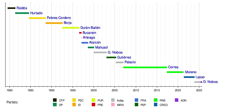 Daniel NoboaGuillermo LassoLenín MorenoRafael CorreaAlfredo PalacioLucio GutiérrezGustavo NoboaJamil MahuadFabián AlarcónRosalía Arteaga SerranoAbdalá BucaramSixto Durán-BallénRodrigo Borja CevallosLeón Febres-Cordero RibadeneyraOsvaldo Hurtado LarreaJaime Roldós Aguilera