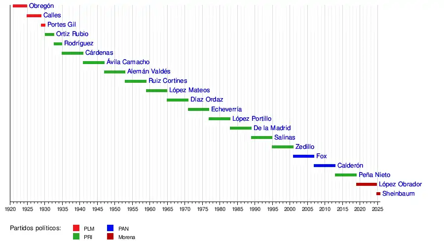 - 65 presidentes y una presidenta en 107 periodos de gobierno; incluyendo los presidentes emanados del Plan de Tacubaya en 1858 (paralelos al gobierno constitucional de Benito Juárez) y a los de la Convención de Aguascalientes (paralelos al gobierno de facto que ejerció Venustiano Carranza entre 1914 y 1917).[9][10]