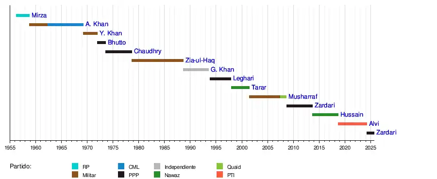 El Presidente de Pakistán es el jefe de Estado de la Pakistán, ejerce la más alta representación del país y es comandante en jefe de las fuerzas armadas del país. El antiguo Raj británico quedó dividió en dos estados independientes el 15 de agosto de 1947, Pakistán y la India. En el estado pakistaní fue elegido primer ministro Liaquat Ali Khan. Desde 1947 fue constituido como Dominio de Pakistán dentro del Imperio, otorgándole total independencia, pero teniendo al rey Jorge V del Reino Unido como jefe de Estado y un Gobernador General como representante del monarca británico. Finalmente en 1956 Pakistán se transformó en una república.