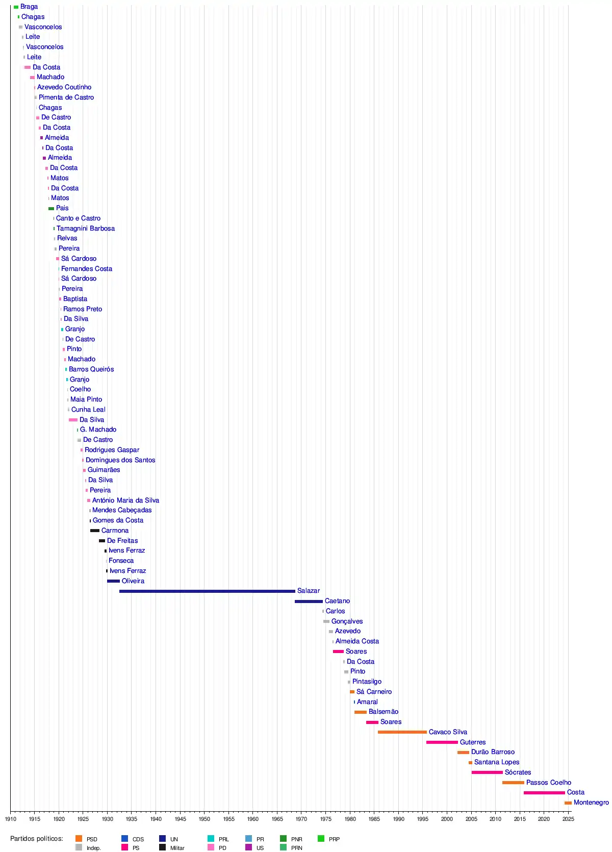 En 1926 el golpe de Estado del 28 de mayo liquida el régimen parlamentario y establece una dictadura (Segunda República Portuguesa) que acabará en el régimen salazarista, Estado Novo, en 1933. El jefe del gobierno portugués mantendrá la denominación de 1910.