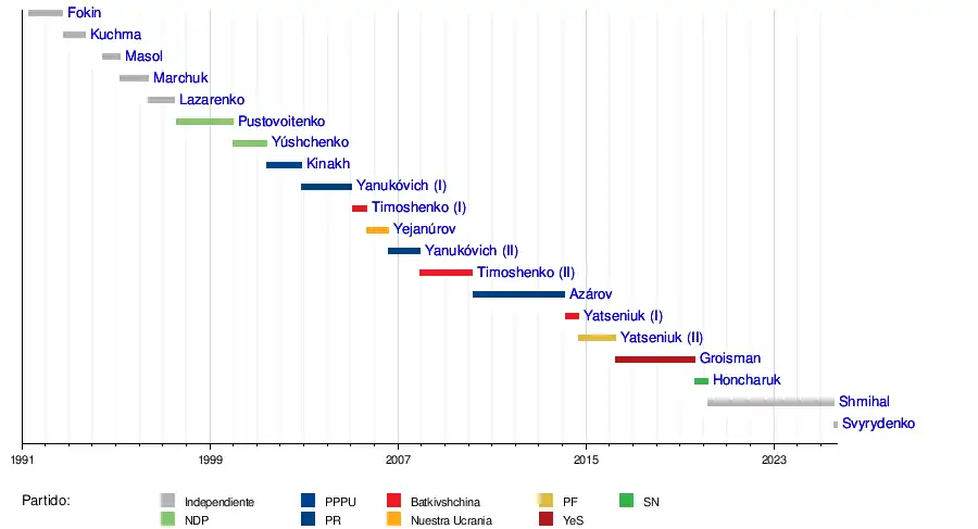 Desde la independencia de Ucrania de la Unión Soviética en 1991, ha habido 18 primeros ministros (21 contando los primeros ministros en funciones). A diferencia del presidente de Ucrania, que es elegido directamente por voto popular cada cinco años, el primer ministro es designado por el presidente tras la ratificación del candidato por el parlamento, la Verkhovna Rada.