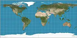 James Gall | Cilíndrica | Compromiso | Con intención de parecerse a la Mercator, mostrando los polos. Paralelos estándar a 45°N/S. Braun es una versión estirada horizontalmente con escala correcta en el ecuador. | |
