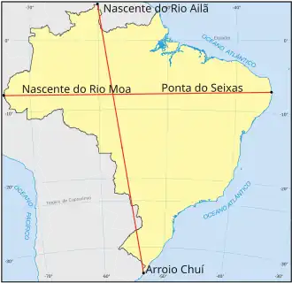 - Punto más oriental: Punta de Seixas, Paraíba (07°09′28″S 034°47′38″O / -7.15778, -34.79389)