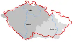 El río Vltava en la capital checa Praga Ríos de la República ChecaCuenca hidrográfica del sistema río Elba-Vltava (gris oscuro) y del Morava-Thaya (gris claro) en territorio checo. Las áreas blancas del noreste y el norte pertenecen al Oder y sus afluentes, mientras que la tira blanca estrecha de la frontera suroeste denota algunos afluentes directos más pequeños del Danubio. El punto triple de la división es el monte Klepý.