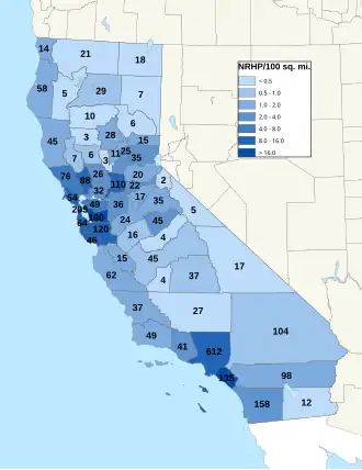 Al 10 de agosto de 2012, hay 2,542 propiedades y distritos en el Registro Nacional de Lugares Históricos en los 58 condados de California, incluyendo a 137 designados como Hito Histórico Nacional.