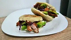 - Musiúa: También llamada gringa, es aquella arepa que se rellena con los mismos ingredientes que componen la típica hamburguesa: croqueta de carne frita o a la parrilla, queso rebanado, jamón York (ocasionalmente), lechuga, tomate y salsas (ketchup, mayonesa, mostaza, salsa rosada, etc.)