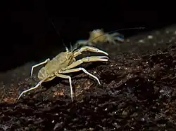 Crustáceo | Es un cangrejo endémico de la isla de Lanzarote. Sólo habita en algunos jameos, como los famosos Jameos del Agua, por lo que se encuentra en grave peligro de extinción.[43] De pequeño tamaño, presenta una coloración blancuzca.[44] Es un crustáceo pequeño, su caparazón no llega a 1 cm de largo y en total puede llegar a medir entre 2 y 3 cm. Es una especie única en el mundo y presenta características muy especiales, como su color, totalmente blanco, ya que es albino. Otra peculiaridad es que, como su nombre indica, tiene el sentido de la vista muy debilitado y por el contrario el oído muy desarrollado. | 1991 |