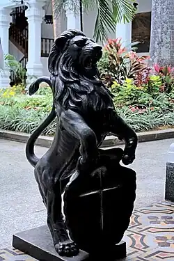 - Escudo: El escudo se otorgó en 1591 formalmente y presenta al león como figura emblemática de Caracas, a partir de la Real Cédula de Felipe II, que la concede a petición del procurador general, en los términos siguientes: "En campo de plata de un león color pardo, puesto en pie, teniendo entre los brazos una venera de oro con la Cruz Roja de Santiago, y por timbre una corona de cinco puntas de oro". A través de una Real Cédula concedida por Carlos III el 13 de marzo de 1766, se oficializa el Escudo de Armas de Caracas, que llevaría una orla con una inscripción en latín sobre la Virgen María como un gesto noble al escudo de la ciudad, con las palabras: Ave María Santísima, sin pecado concebida en el primer instante de su ser natural. La petición original (Ave María Santísima de la luz sin pecado concebida) suscitó una polémica sobre sí debía o no colocarse en la orla del pendón, la cual concluyó con la decisión del Rey, que suprimió la palabra Luz, incorporando "en el primer instante de su ser natural".