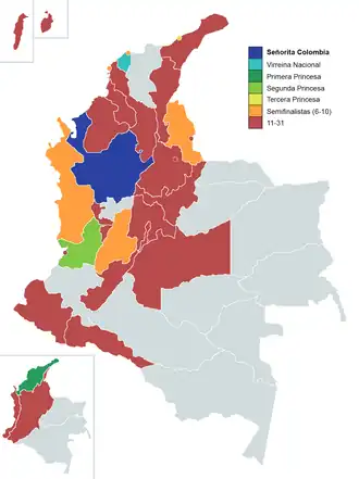 Mapa que muestra las ciudades y departamentos que participaron en Señorita Colombia 2024-25 y sus resultados finales