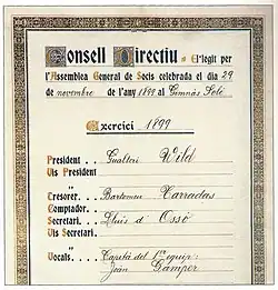 - 29 de noviembre: primera asamblea, firma del acta fundacional del club y formación de junta directiva con Walter Wild (presidente), Bartomeu Terrades (tesorero), Lluís d'Ossó (secretario) i Hans Gamper (capitán).[8][9]