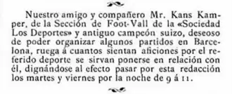 - ↑ Al no existir todavía la figura de entrenador tal como la conocemos hoy día, fue Joan Gamper quien, por su mayor experiencia en otros clubs europeos, se encargó de orientar deportivamente a sus compañeros en los primeros años de vida del FC Barcelona.